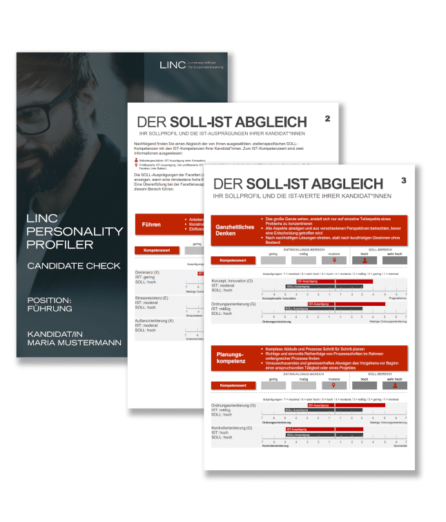 - e.g. use of the personnel diagnostic tool LINC PERSONALITY PROFILER (LPP) – CANDIDATE CHECK – as an online-supported personality test, which offers a professional comparison between the central requirements of a position to be filled (TARGET PROFILE) and the personality profiles of job candidates (ACTUAL PROFILE).